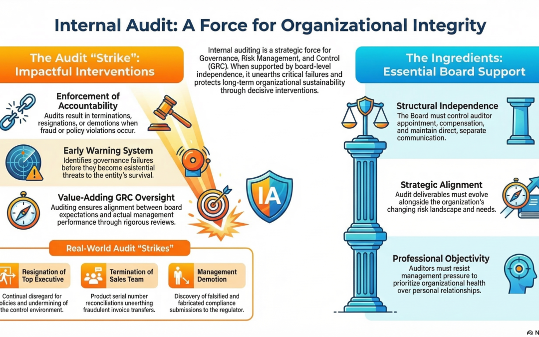 But these value adding prospects have a flipside for the typical audit clients. Yes, as it is said, the road to evaluation and improvement of GRC systems is not linear, for the clients who get to witness the worse it gets! To the vast majority of audit clients, the flipsides are undesirable by-products of internal auditing interventions. They are undesirable because they stem out of the internal audit’s independence and objectivity. And that’s how the internal audit strikes!